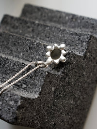 Elegant Montana agate pendant featuring a 10x14mm one of a kind rose cut stone. Set in sturdy sterling silver prong claws with an open back, allowing light to illuminate the stone. Back of pedant showcases a minimal floral design. Suspended on a delicate rope chain, perfect for layering.