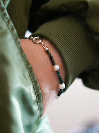 This bracelet is made of pearl string that can become delicate when wet. Avoid exposing to water, chlorine, saltwater, or any body care products.